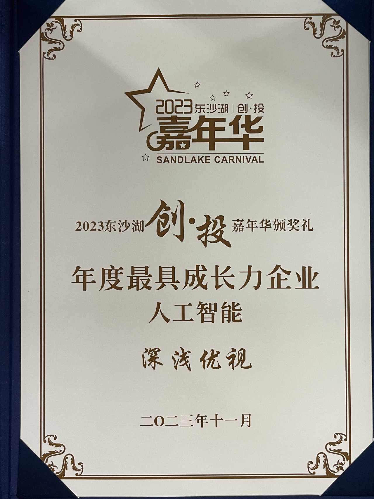 11月13日,2023年東沙湖『創·投』年度榜單重磅發布,深淺優視憑借領先的行業經驗,專業的産(chǎn)品技術、優質的企業經營,榮獲2023年度人工智能領域最具成長(zhǎng)力企業!